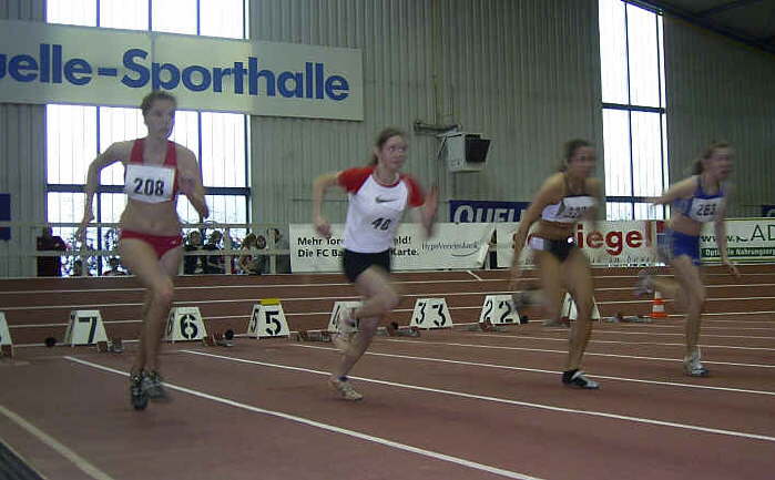 60 m Hürden: Auf Bahn 7 mit der 40 Isabel Häupler (LG Kreis Ansbach), links neben ihr Anna Kreiner (TS Herzogenaurach)