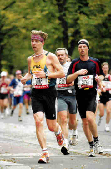 Sonne, der Regen blieb aber aus. Die Quecksilbersäule verharrte bei 13 Grad. Ich entschloá mich, das Rennen im 4:30er Schnitt anzugehen, das hätte im Ziel 3:10 Std. bedeutet. Lange