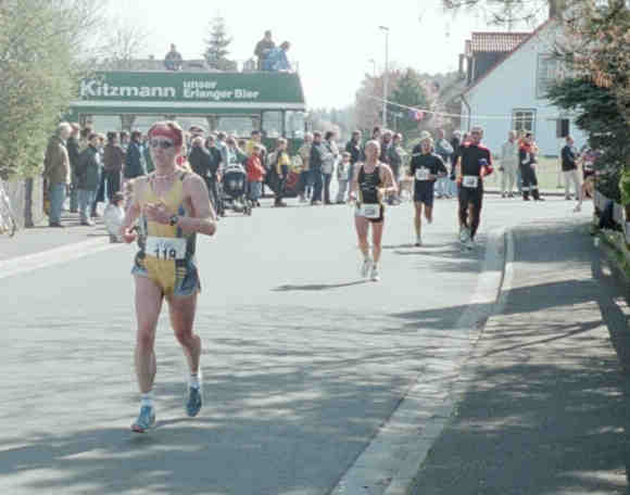 Ansbacher Duelle. Im Vorjahr lief er nur 1:29, er schien also Großes vorzuhaben. Das er viel trainiert hatte, wußte ich ja. 20 Minuten für 5 km, 39:39 bei km 10 - irgendwann muß doch