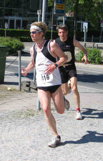 erholte mich, konnte kontern und nahn vor Ralf die Steigung zum Marktplatz in Angriff. Ralf wieder an meiner Seite. Letzte Linkskurve, Toni gerade im Ziel. Mich trug es nach rechts,
