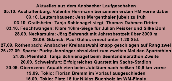 Wer mehr über mich oder auch über das aktuelle Laufgeschehen in Ansbach erfahren möchte, ist hier richtig. Hier geht es um mein Hobby: ums Laufen und um viele, mit denen ich zusammen trainiere und